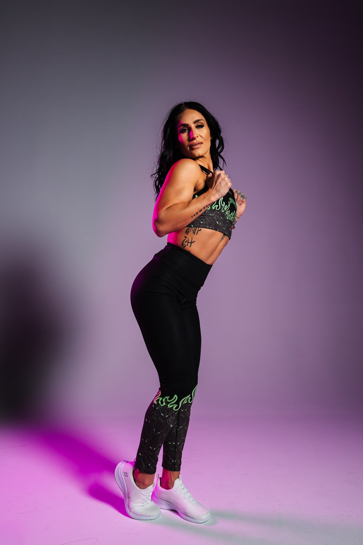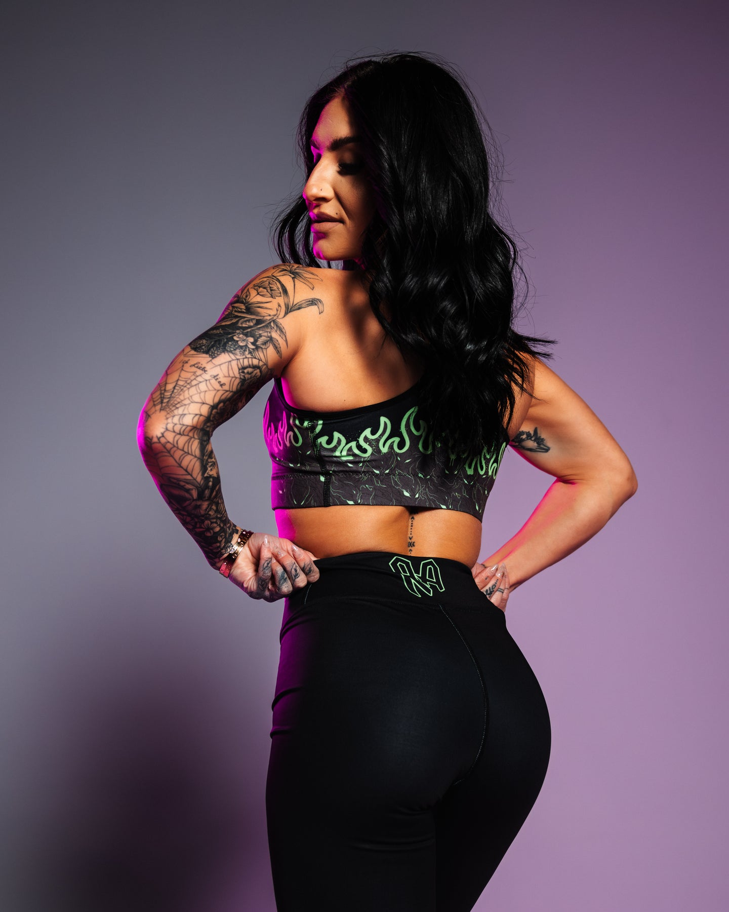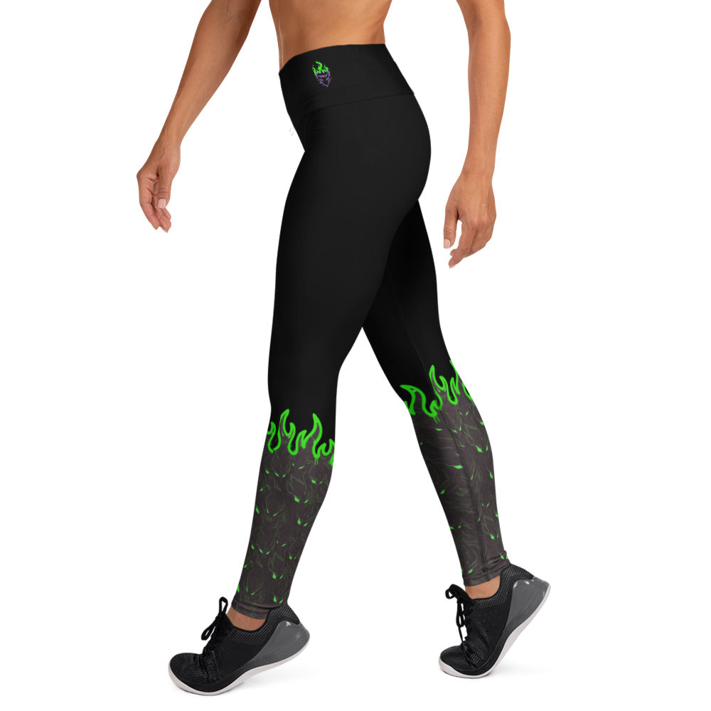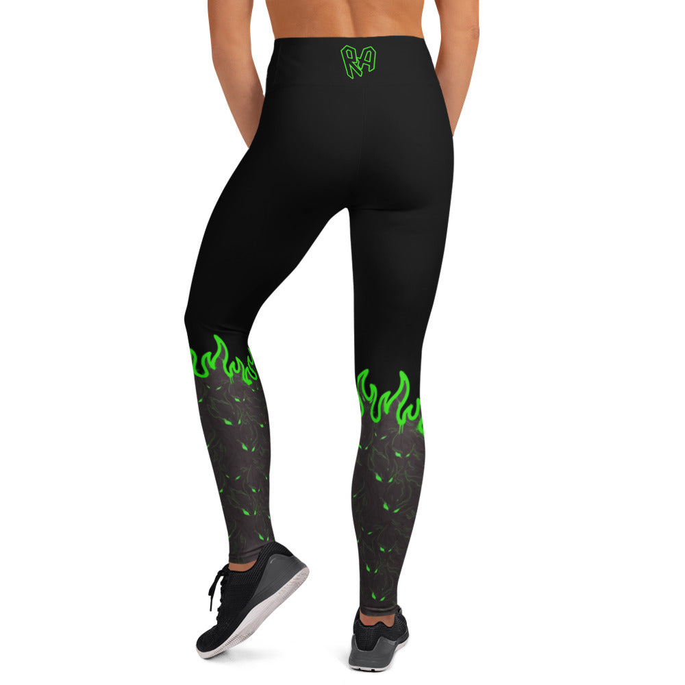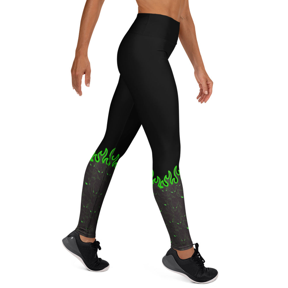 These leggings feature a recurring demon pattern that rises into flame from the lower leg before fading into black — symbolizing pressure, heat, and controlled evolution. Built with a raised waistband and four-way stretch, they deliver a locked-in, sculpted fit designed to endure high-output training and long sessions.